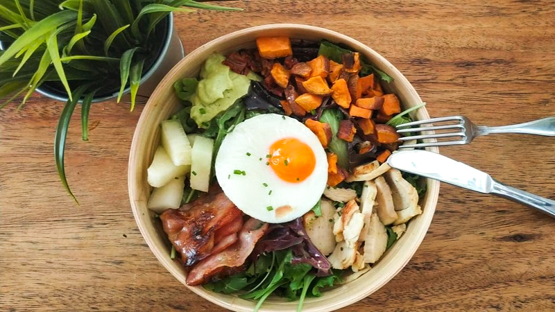 C/ mix de alface e rúcula, creme fraíche, ovo, tomate cherry e. cebolinho